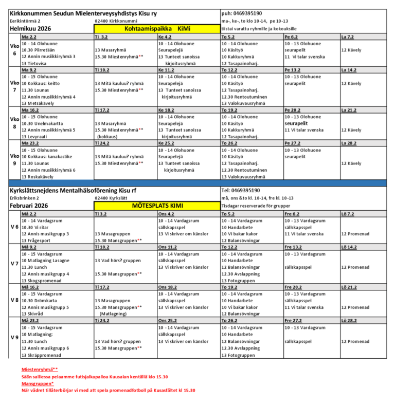 Ryhmät tapaavat KiMin tiloissa Eerikintörmä 2, jos ei erikseen ole mainintaa.